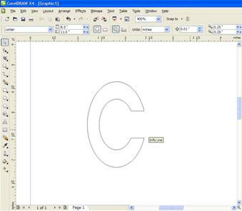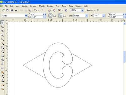 Lanjut, lalu kita akan membuat segiempat ketupat dengan alat Bezier tool pada toolbox yang akan ditempatkan ditengah-tengah gambar menyerupai “ C “. Caranya dengan Klik pada pojok yang satu ke pojok yg lainnya, Jadi nanti ada 4 titik/pojok, setiap klik pojok satu dengan yg lainnya akan membentuk garis lurus. Seperti gambar yang dibawah ini :